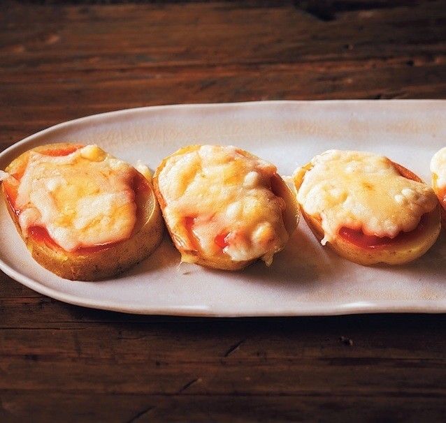 2、1 を厚さ1cmに切って、アルミホイルに並べる。じゃがいもの表面にケチャップを塗ってチーズをのせ、トースターに入れて、こんがりと7~8分焼く。
