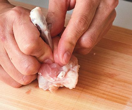 1.鶏肉は先端を切り落として塩をすり込み、網などにのせて冷蔵室に入れて1日以上おく(ラップは掛けない)。乾燥したらペーパーで水けをふき、切り口の骨のまわりにはさみでぐるりと切り目を入れ、骨をしんにして身を先端に押し、形を整える。