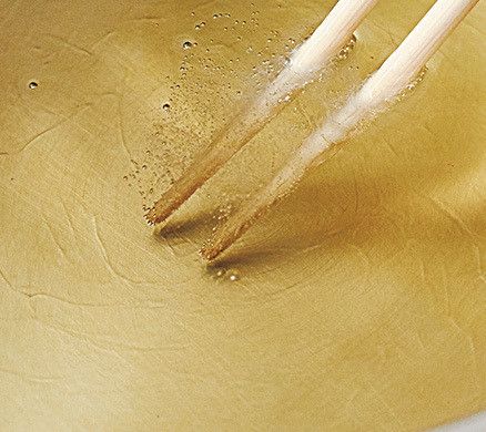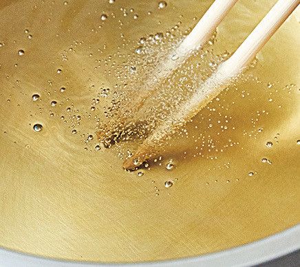 ぬらしたふきんで拭いた菜箸を油に入れると、箸全体から勢いよく泡が出る状態