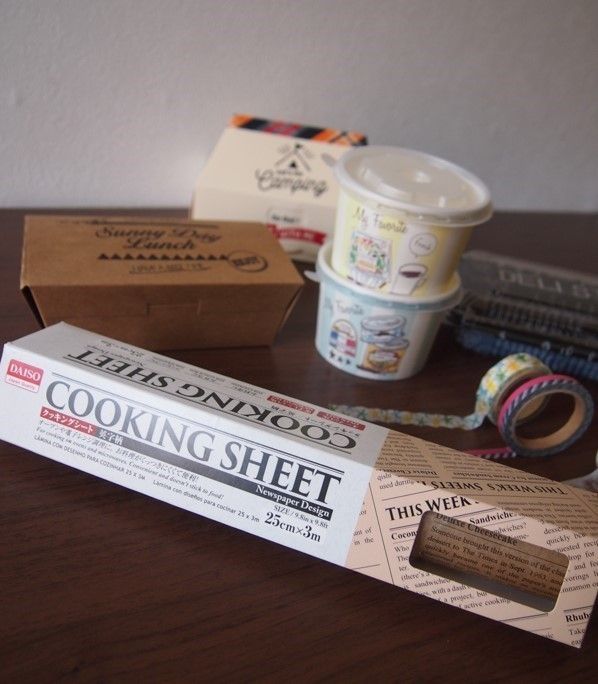 デザイン、形ともに様々な種類があるランチBOX各¥100(税抜)、カラフルで彩りにも使えるマスキングテープ各¥100(税抜)、オーブン、レンジ対応英字クッキングシート各¥100(税抜)があれば、完璧!とくにクッキングシートは英数字などオシャレなものが出ているのでぜひ探してみてくださいね。