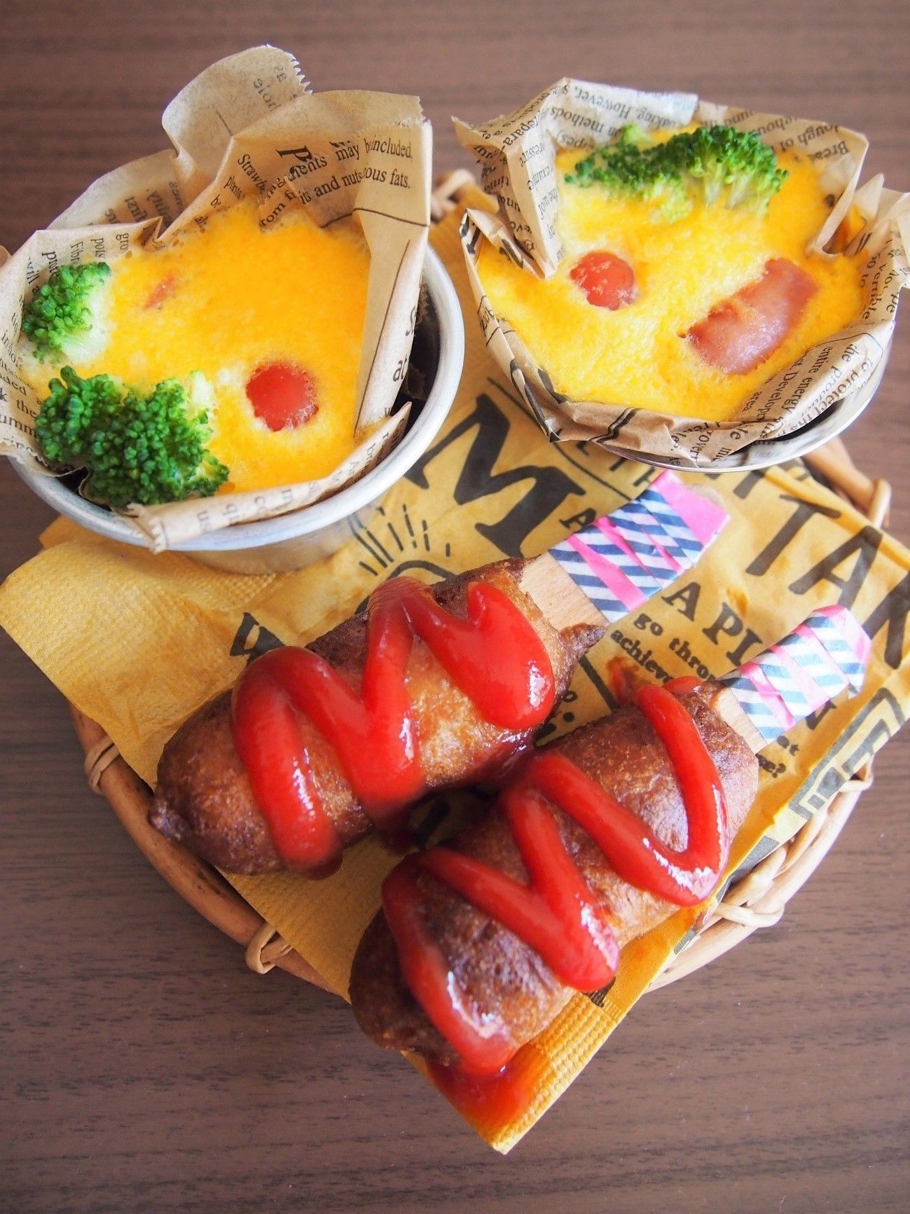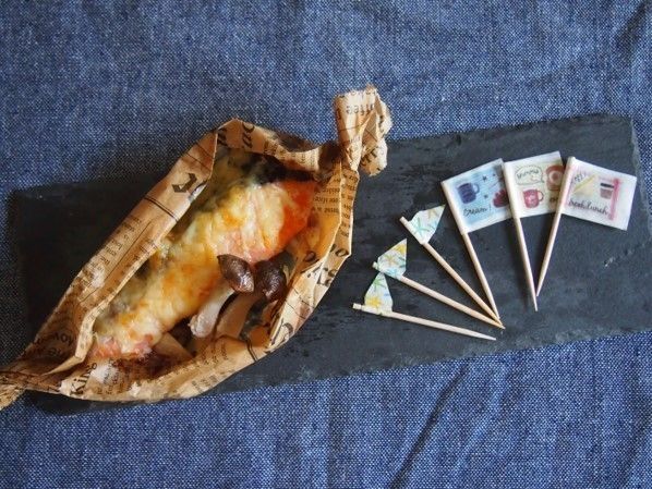 オーブン対応の英字クッキングシートを、キッシュのカップイン!大きさも自分で調整できるところも大人用、子供用と作れて便利なところ。ホットドックは持ち手の部分をマスキングテープでくるくる巻けばポップになって可愛いです。