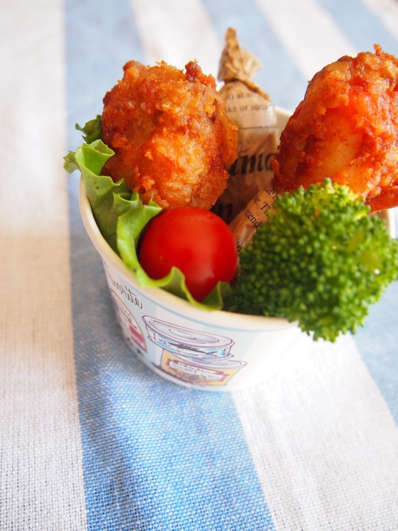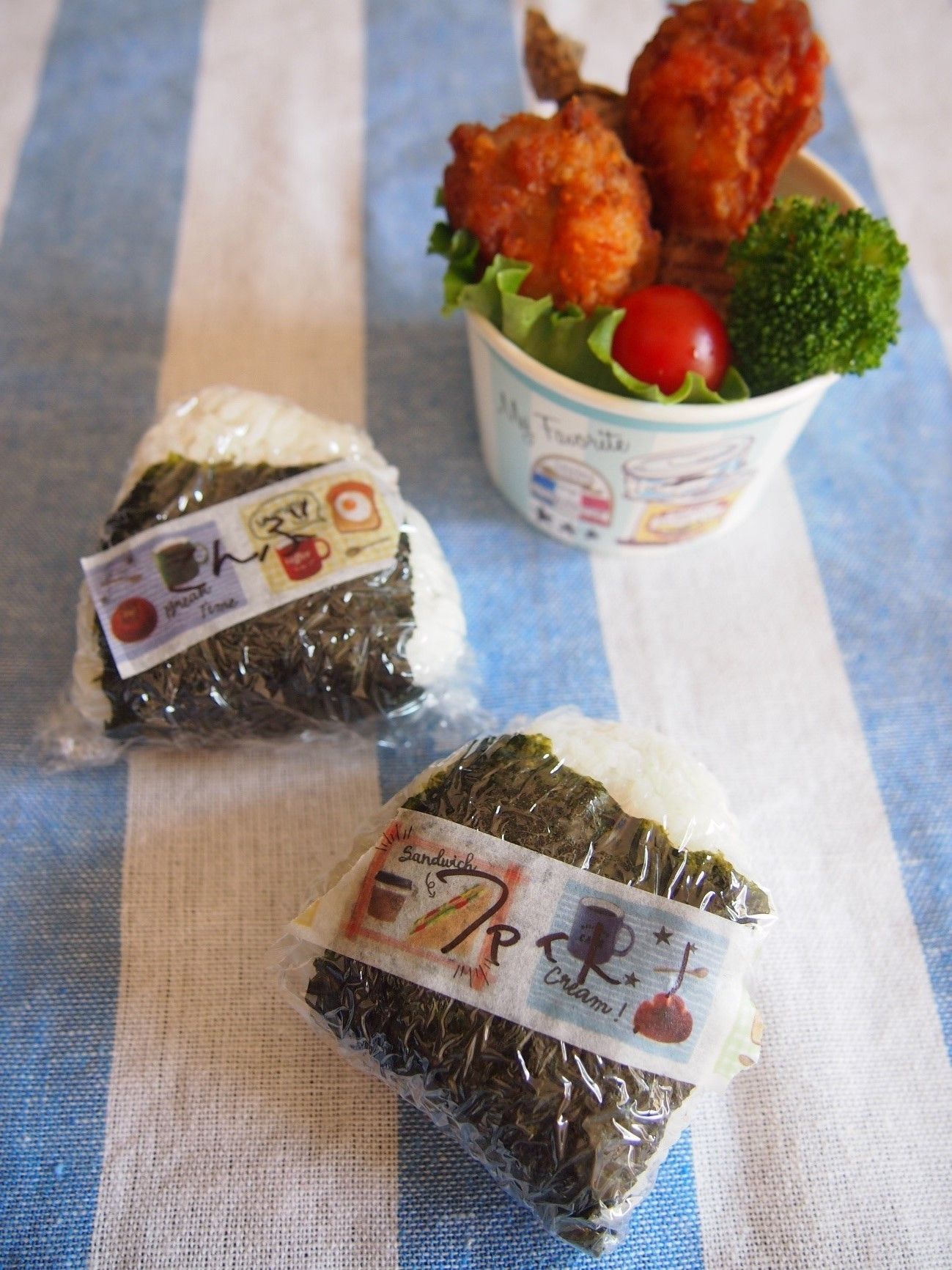 手羽元の唐揚げはクッキングシートをまけば、持って食べやすいです。おまけに手も汚れず〇。おにぎりは、マスキングテープをペタリとして具やメッセージを書く、そのひと手間が喜ばれます。