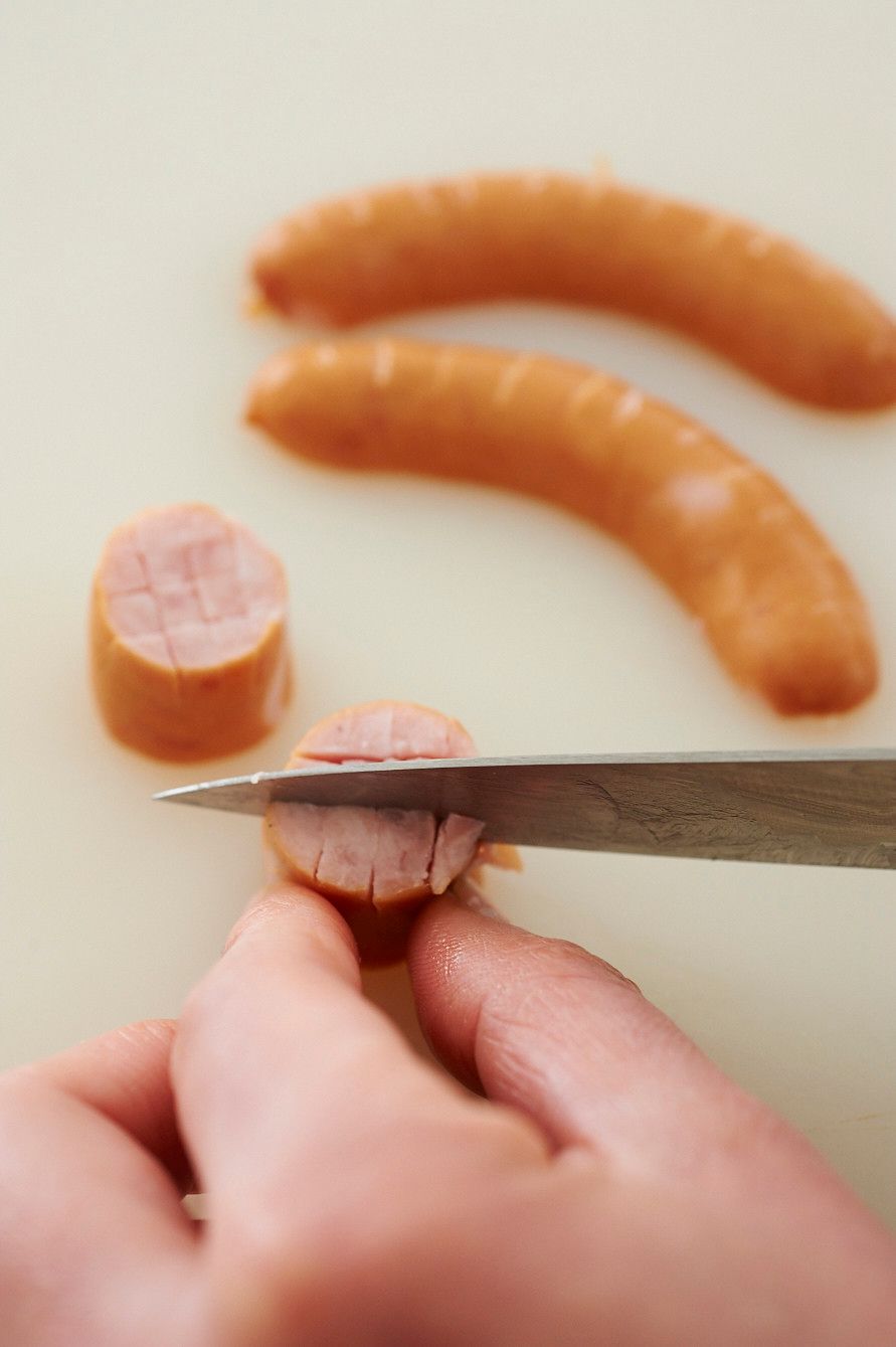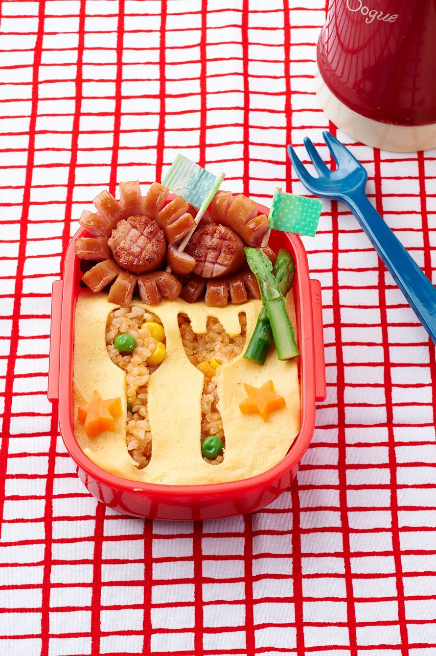 また、子どもが大好きなオムライスを詰めたおべんとうには、大きなマーガレットのソーセージをプラス。ちょっと難しそうに見えるけれど、実は簡単。ソーセージに切り込みを入れて焼くだけでできあがります。