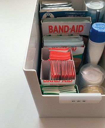 お手入れグッズはみんなが集うリビングの収納棚に。ケガが絶えない男子2人+園児がいるので、ばんそうこうは背の高さ順に並べて子どもたちにも取り出しやすくしています(整理収納アドバイザー/勝谷ゆみさん)