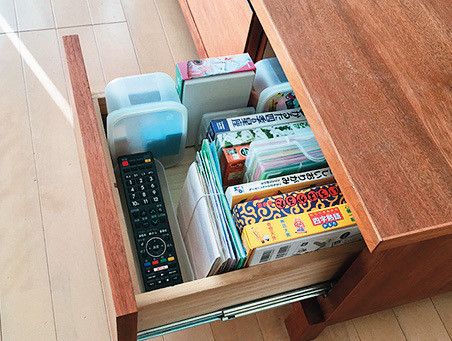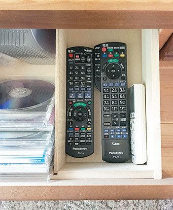 テレビやエアコンなど部屋にあるリモコンはすべてテレビボードの引き出しへ。あちこちに置くより1カ所にまとめると、散らからないし「どこにある?」なんてこともなくなります(Kaoriさん)