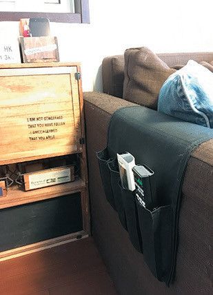 リモコンはソファのひじ掛けにポケットをつけて一つ一つ収納すれば、バラつくこともありません。ソファに座ってテレビを見る際も移動せずにサッと取り出せてラクチン!(早希さん)