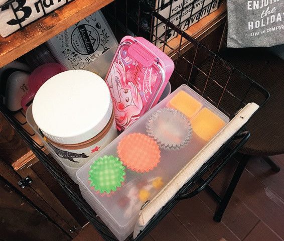 べんとう箱だけでなく、カップやナプキンなど関連グッズをかごにひとまとめにしてキッチンに収納。慌ただしい朝も、かご1つだけを取り出して準備がスタートできます(Kaoriさん・早希さん)