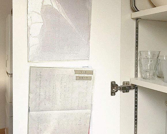 学校からのプリントは、毎日開ける食器棚の扉裏に貼付。プリントが行方不明にならないのはもちろん、必ず目に留まるので大事な行事や提出物の締め切りも忘れません(整理収納アドバイザー/勝谷ゆみさん・Kaoriさん)