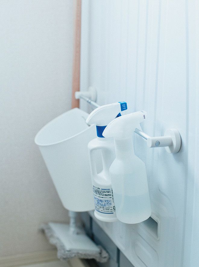 洗面所は、髪の毛やホコリがたまりやすいもの。洗濯機にマグネット式のバーをつけ、洗剤や小さなゴミ箱を引っ掛けて収納。モップも専用ホルダーで宙に浮かせています。これなら床の物をどかさず、すぐに掃除できていつもピカピカ。
