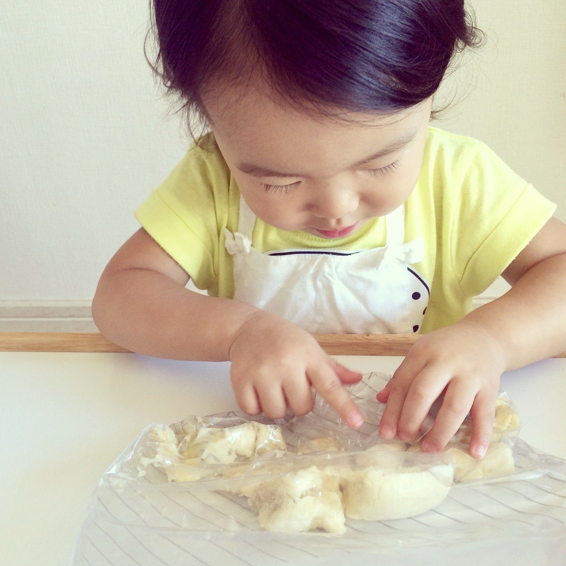 まずは、「バナナを密閉袋に入れて、子どもに指で押してつぶしてもらいました」。つぶしたバナナは、ビヒダスプレーンヨーグルトと砂糖、オレンジジュースと一緒にボウルに入れて、なめらかになるまで混ぜれば完成!
