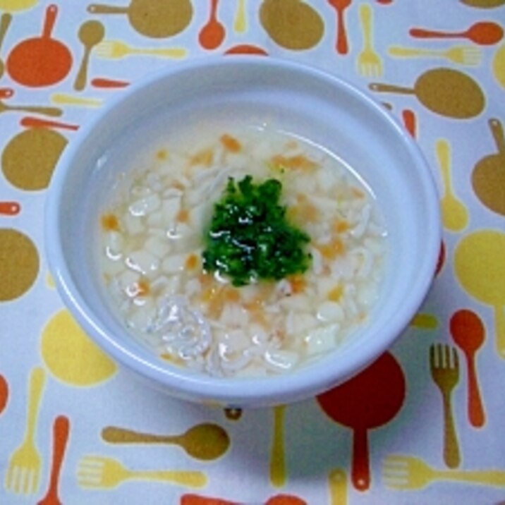 少しでも早くおかゆを食べたい時に役立つのが、こちらのミルク粥のレシピです。通常は鍋でコトコト煮込んでやわらかくするおかゆ料理ですが、電子レンジを使った時短のつくり方もあります。