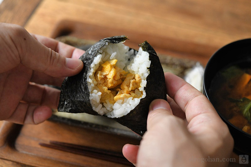 炒り卵にしょうゆを振って、ごはんと海苔でぎゅっと包んだおにぎりです。シンプルな味付けながら、卵とごはんの一体感が楽しめる仕上がりになっていますよ。箸などを使わずに食べられるので、洗い物を増やしたくないときにもおすすめです。