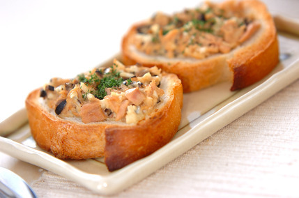 バゲットを食べやすい厚みに切り、混ぜ合わせた材料をのせてトーストするだけ。甘酢や練りからしがアクセントになっていて、さっぱりと食べられますよ。
