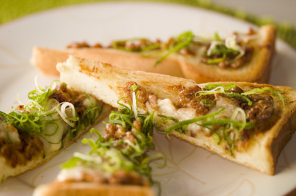 納豆に、たれ、マヨネーズ、鰹節などを混ぜ合わせ、バターを塗った食パンにのせてチーズをかけてトースト、仕上げに刻みねぎを散らしてつくります。ピザのように切り分ければ、片手でつまんで食べやすくなりますよ。和と洋の香りが組み合わさった満足感のある一品です。