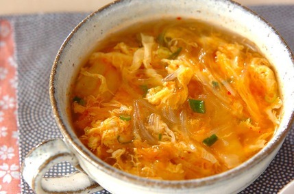 春雨は熱湯で戻して水気を切り、固形スープの素などを鍋で温め、春雨とキムチを煮込んで溶き卵をふんわりとさせたら出来上がりです。キムチの酸味や辛味が食欲をそそり、低カロリーでありながら食べごたえのあるスープとなっています