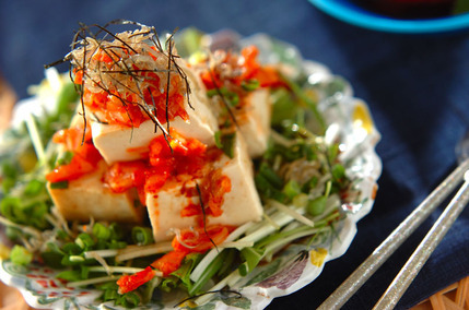 水気を切った豆腐の上に、キムチ、ごま油で炒めた熱々のちりめんじゃこ、刻んだねぎ、海苔、醤油ベースのたれをかけます。一緒に添えた水菜などの野菜と一緒に混ぜ合わせ、ザクザク、カリカリとしたいくつもの歯応えが楽しめる一品に。豆腐もトッピングもヘルシーなので、ボリュームがありながらも低カロリーとなっていますよ。