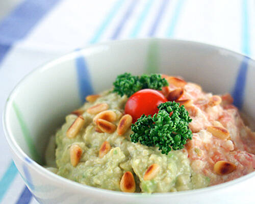 トマトの「赤いディップ」、アボカドの「緑のディップ」、2色の色合いが美しい一品。新鮮かつおいしい麺レシピなので、気分を変えたいときにもぴったりです。トマトは皮を湯むきし、食感をよくするのがポイント!