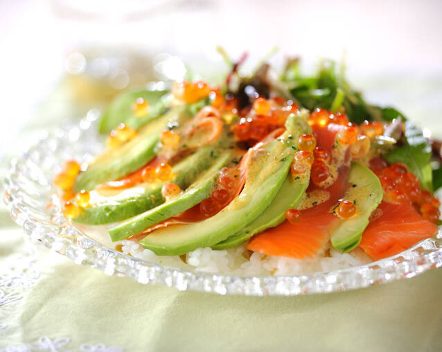 見た目が華やかでパーティーフードにピッタリな、アボカド洋風ちらしずしのレシピです。無糖ヨーグルトとマヨネーズを合わせたソースが味のアクセントに!生ハムの塩分が気になる場合は、ハムで代用も可能です。