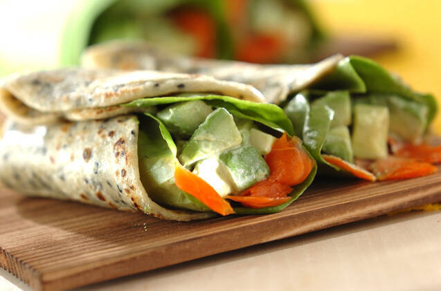 モチモチで香ばしいクレープ生地に、野菜やスモークサーモン、アボカドタルタルをイン。クレープ生地は、食事にもデザートにもアレンジOKです。タルタルも、おつまみやサラダに加えて楽しめそうですね!