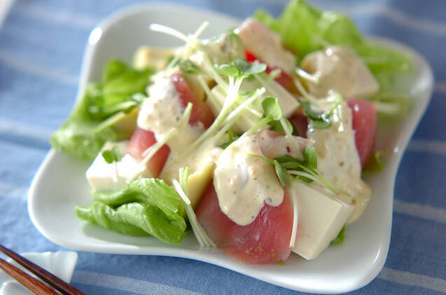 和風ドレッシングで和えた、アボカドと豆腐の和風やみつきサラダのレシピです。食べる時に、お好みで刻みのりを散らすと美味しさがアップ!豆腐は崩れやすいため、優しく和えましょう。