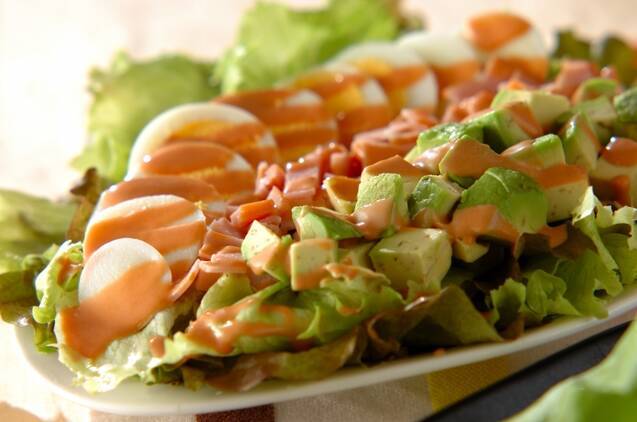 相性抜群なアボカドとエビ。その2つの食材を使ってつくるのが、「エビとアボカドのサラダ」です。マヨネーズとケチャップ、しょうゆなどを混ぜてつくるオーロラソースを和えてつくるサラダとなっています。いくらでも食べ進められる一品ですよ。