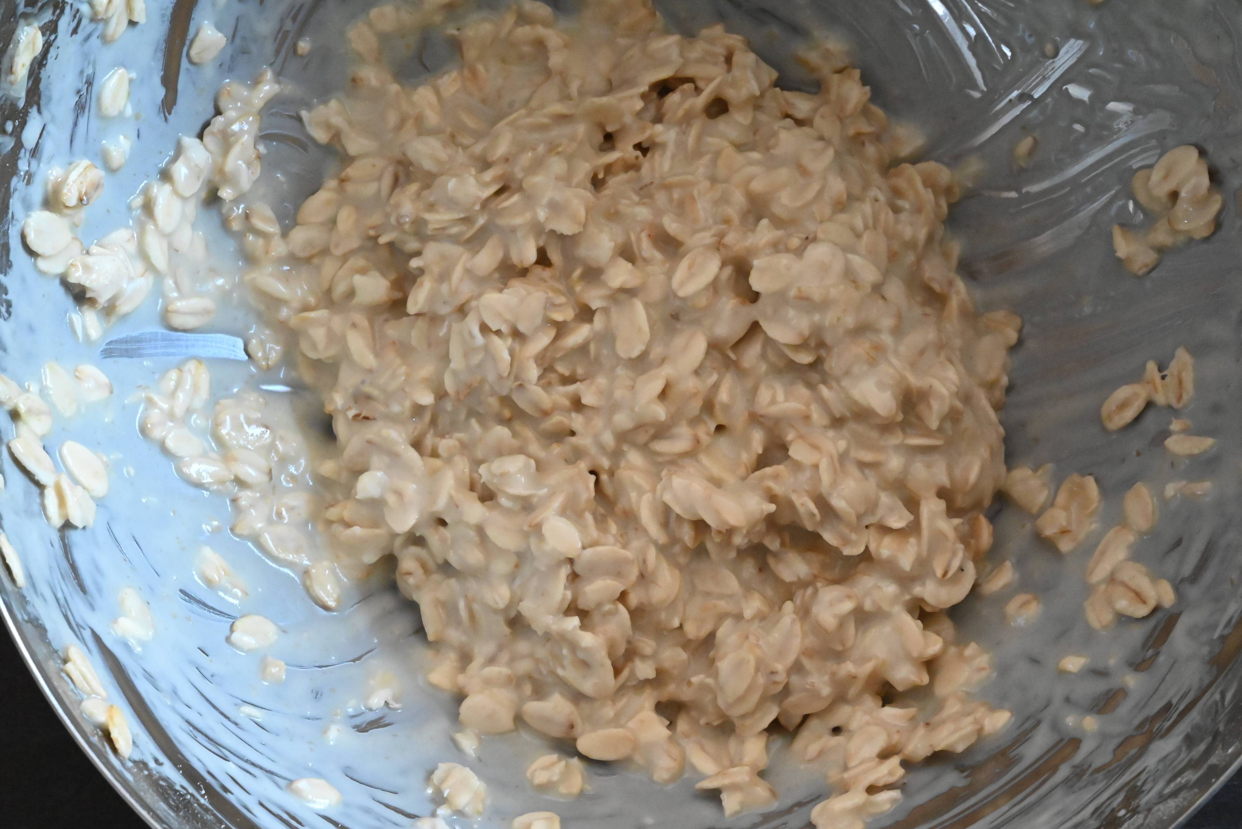 (1)オートミール、片栗粉、ベーキングパウダーを混ぜ合わせる。