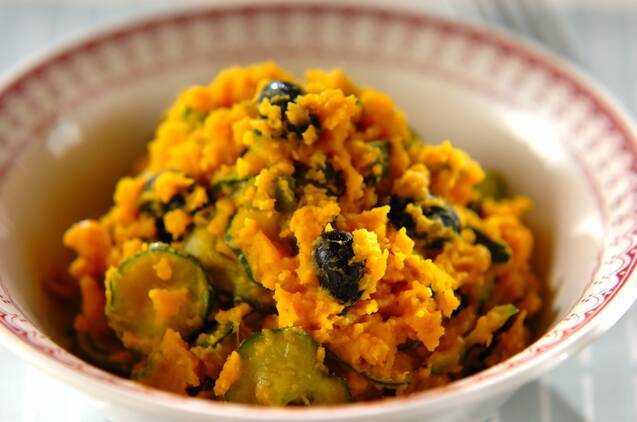 黒豆とキュウリを混ぜたカボチャのサラダ。きな粉入りドレッシングの塩気に、黒豆とカボチャの甘みがバランスよくからんでいます。きな粉の香ばしさも、ほどよいアクセントになった一品です。