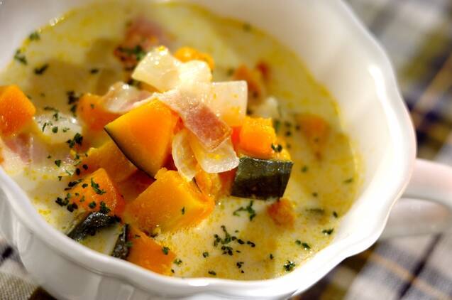 ミキサーなしで、約15分で完成するかぼちゃスープのレシピです。カットしたカボチャ、玉ねぎ、ベーコンの、それぞれのおいしさの組み合わせを楽しめそう。牛乳のまろやかさも相まって、お子さんにもよろこばれそうな一品です。
