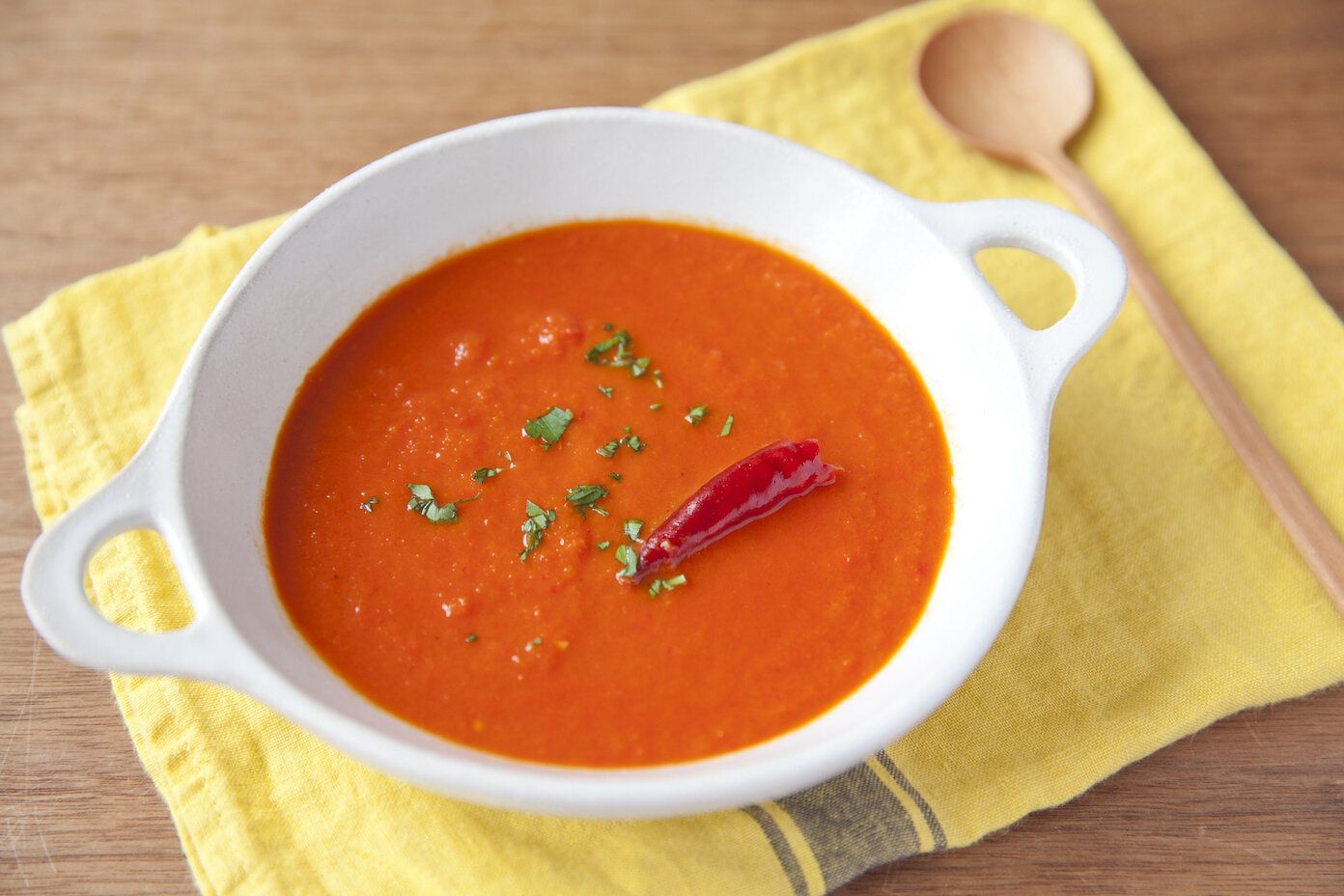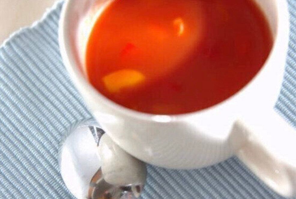 トマトジュースを使い、10分程度で仕上がるインド料理のラッサム風パプリカスープです。トマトジュースの酸味と、赤唐辛子のスパイシーさでさっぱりとした味わいに。パンはもちろん、ご飯にもよく合います。