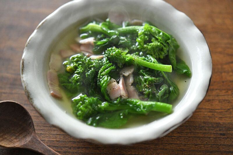 菜の花の優しいうま味が染みわたる、菜の花の具だくさんスープのレシピです。だし汁を使わずにベーコンなどの食材をたっぷりと入れて調理。苦みを感じるかたはだし汁を使っても◎。