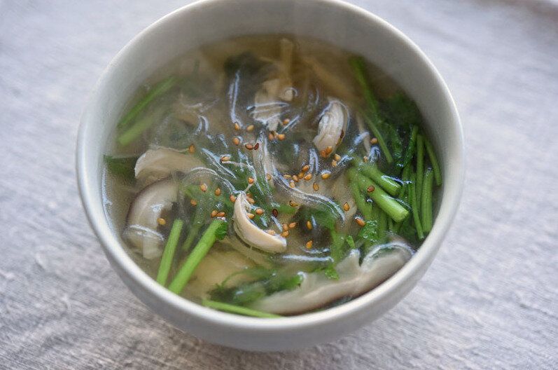 ダイエット中にもオススメな、低カロリーで食べ応えのある春雨スープのレシピです。しいたけのほかに、三つ葉やせり、薬味ネギなどの青みを加えることで、うまみたっぷりで栄養満点なスープになります。