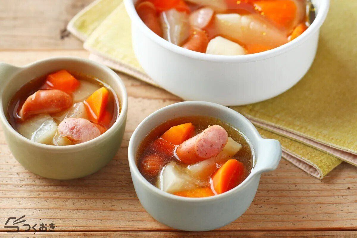 かぶとソーセージが入った、食べごたえのあるコンソメスープのレシピです。ほっこりと煮えた野菜は、シンプルでありながらもほっと落ち着く優しい味わい。粉チーズや唐辛子パウダーでアレンジしてもいいですよ。