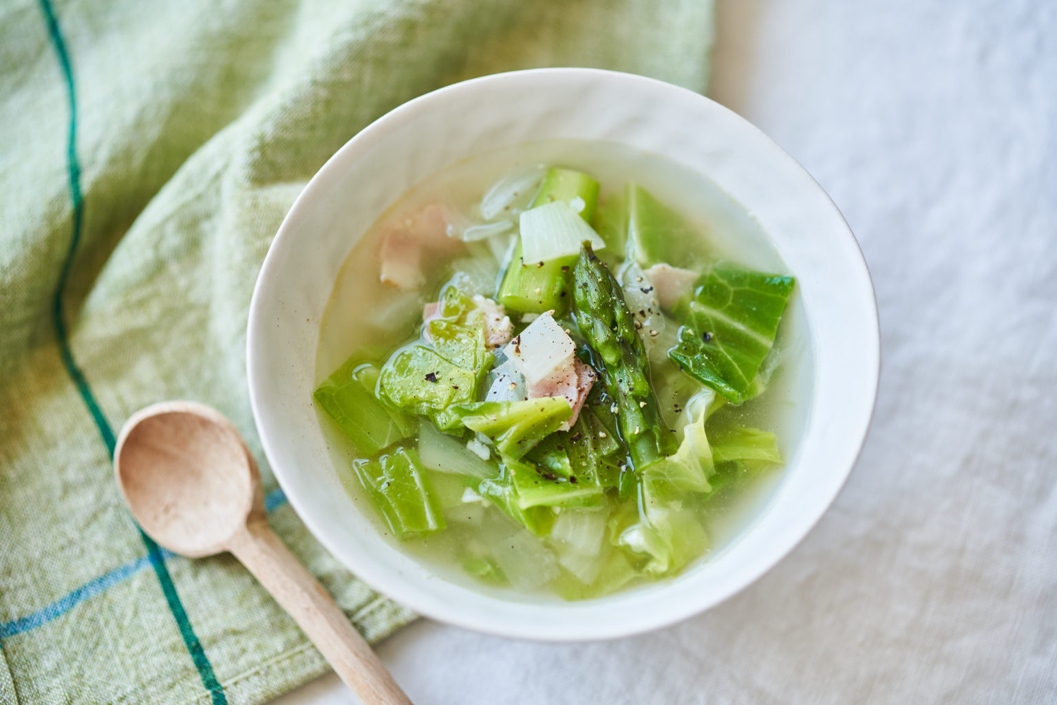 春キャベツ、新玉ねぎ、アスパラガスなどを使った、塩麹スープのレシピです。野菜の鮮やかなグリーンと、ベーコンのピンクの相性ばっちりのメニュー。塩麹のやさしい甘みも感じられそうですね。