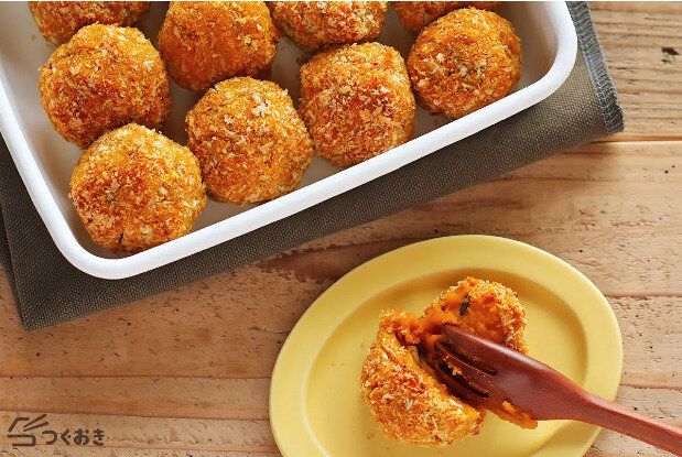 マッシュしたカボチャに片栗粉を混ぜることで、もっちりとした食感を味わえるだけでなく、成形もしやすくなる一石二鳥なレシピです。一口サイズに成形してオーブンで焼くことで、さっくりと軽い食感になります。冷凍や冷蔵での保存も可能なので、たくさんつくってお弁当のおかずやちょっとしたおやつがわりにも便利です。