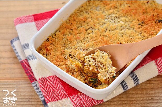 柔らかいので成形がむずかしく、揚げる際も破れて失敗してしまうことが多いカニクリームコロッケも、スコップコロッケにすれば、誰でも失敗知らずで簡単につくることができます。パン粉にオイルを混ぜ合わせてトッピングすることで、オーブンで焼いてもべちゃっとならずサクサクとした食感を楽しめます。