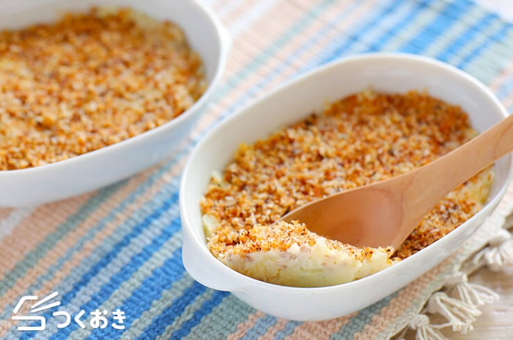 ひき肉のかわりにツナ缶を使っているので加熱する手間がなく、マッシュしたじゃがいもにそのまま混ぜるだけで手軽につくれます。揚げずにオーブンで焼くことで、サクッと香ばしい仕上がりになるだけでなくカロリーも抑えられるので、ダイエット中でも気兼ねなく食べることができます。