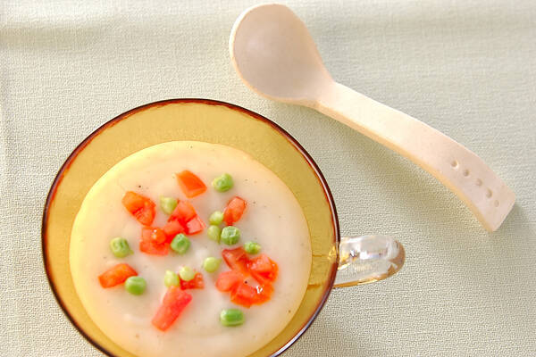 こちらはなんと、コロッケをポタージュスープにリメイク。意外性のあるレシピですが、リッチなコクを味わえます。スープの上に散らしたトマトやグリンピースの彩りもきれいで、見ても食べても満足感のあるおかずスープです。