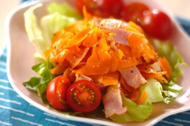 ニンジンやベーコン、レタスにトマトも入った彩り豊かなサラダのレシピ。粒マスタードとはちみつの味つけがポイントで、野菜もたっぷり食べられそうです。洋食の副菜におすすめです!