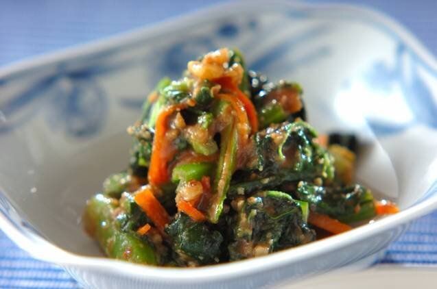 粗くつぶしたクルミの食感が楽しい、あえものレシピです。はちみつの甘みとクルミのコクが、小松菜の苦みにマッチ!オレンジと緑の鮮やかな色合いが、食卓に彩りを添えてくれます。