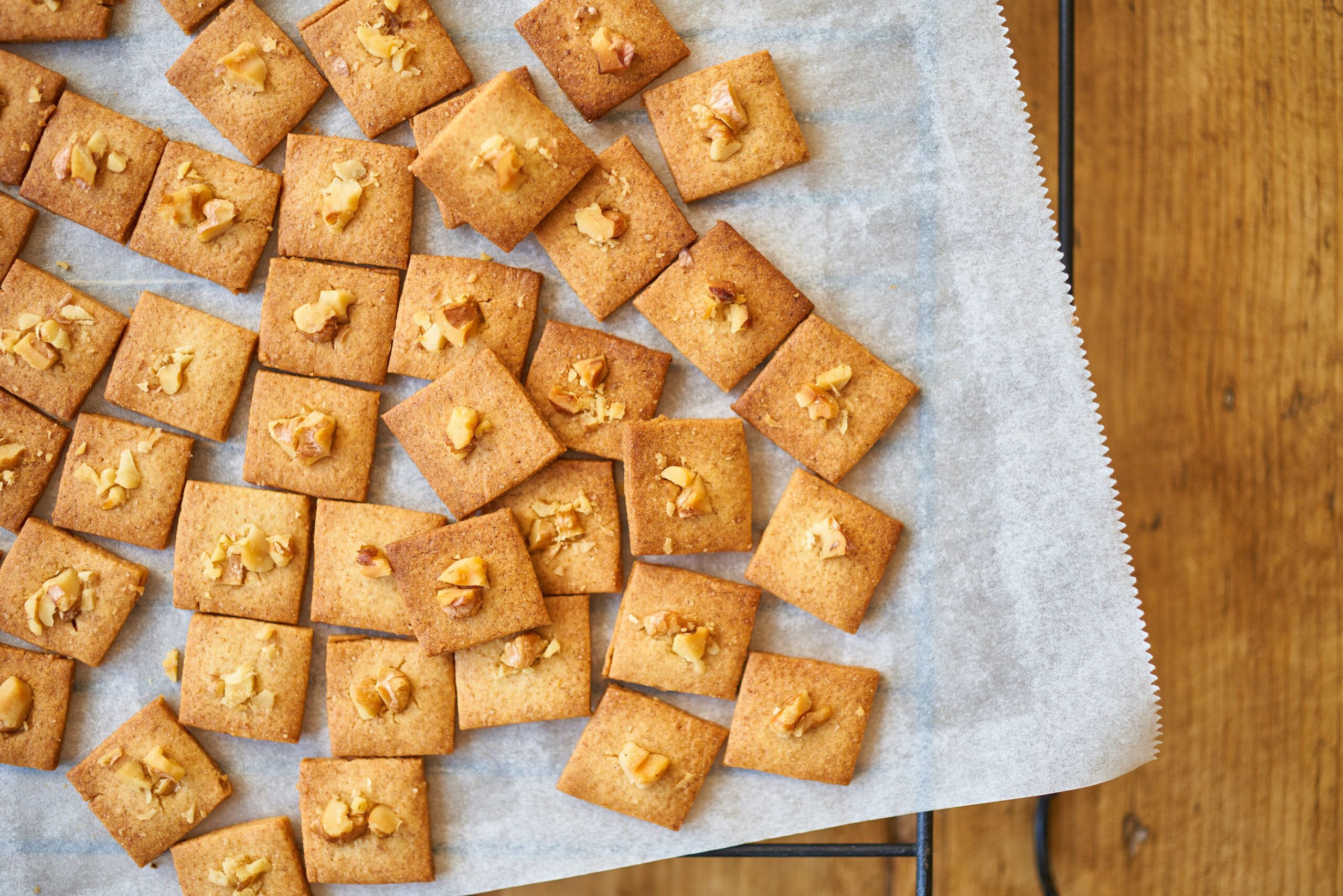はちみつときび砂糖を使った、素朴な味わいのクッキー。トッピングのくるみが、見た目と食感にいいアクセントを与えてくれます。生地は型抜きせずに包丁で切るので、洗いものも少なく簡単につくれるのがうれしいポイントです。