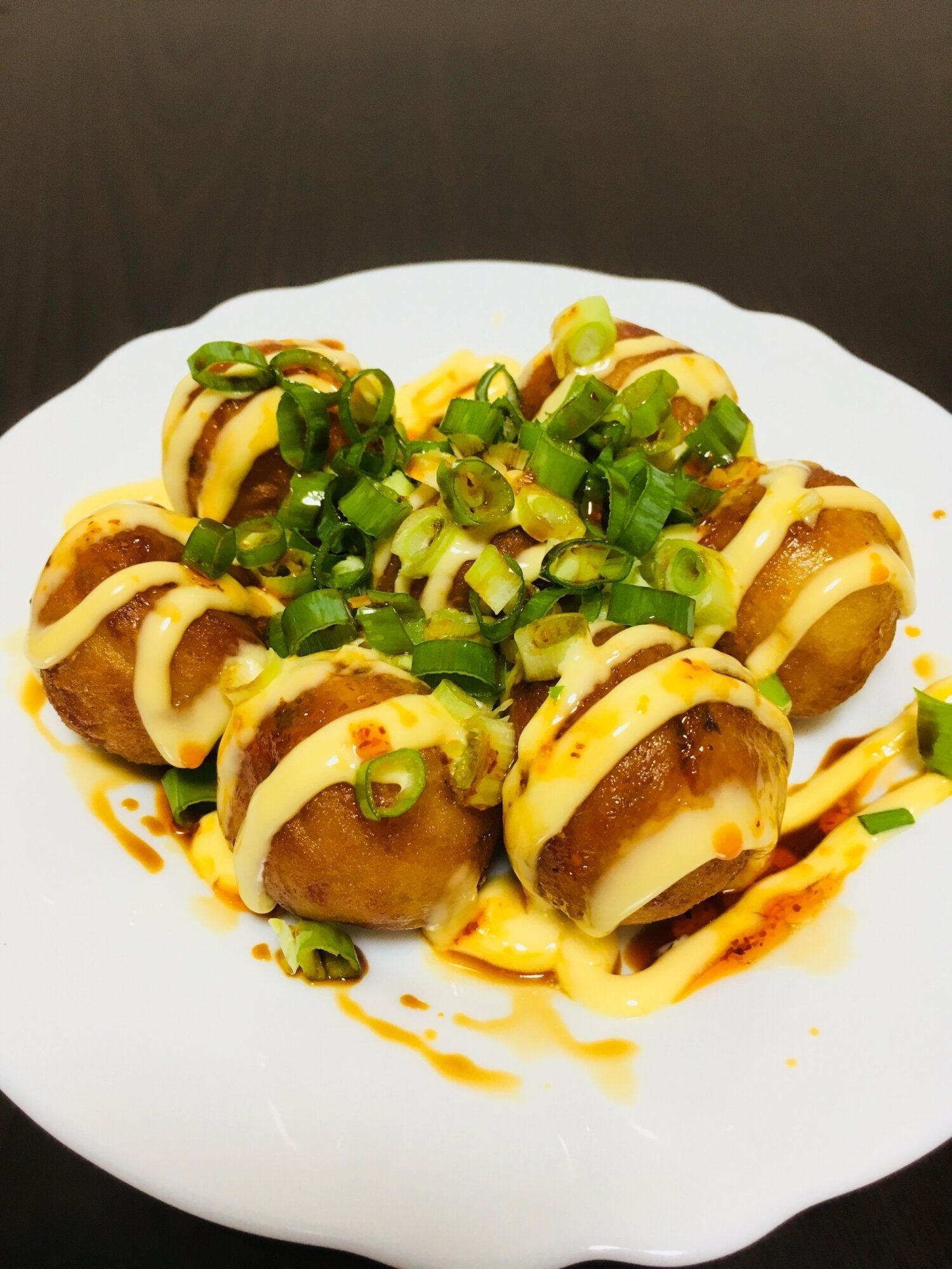 冷凍たこ焼きを油で揚げるだけで、おつまみにぴったりな一品が完成します。マヨネーズのコクと七味の辛味で、お酒が進むこと間違いなし。カリカリの揚げたこ焼きと、シャキシャキとした青ネギの食感の違いも絶妙です。