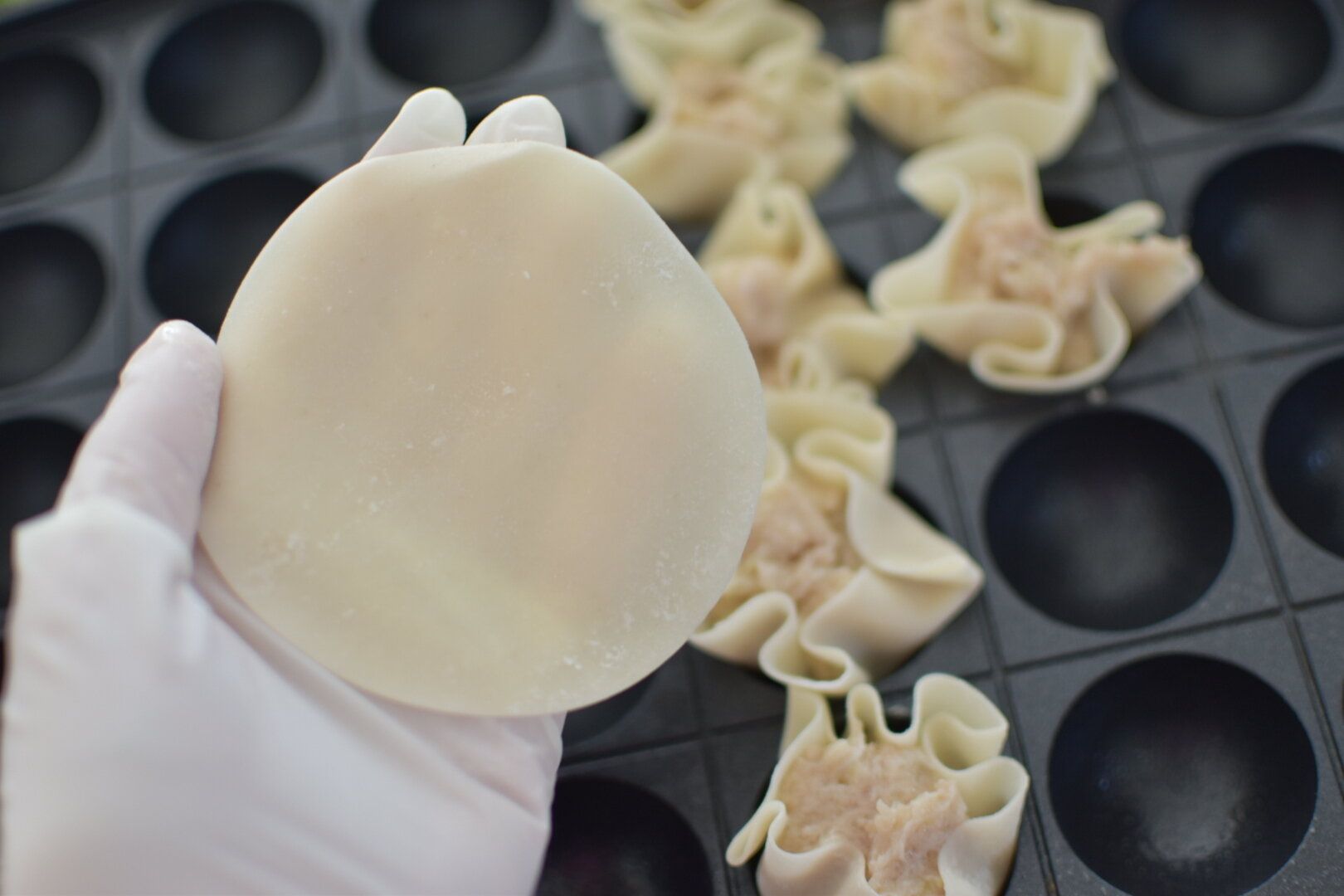 シュウマイの皮もしくは、餃子の皮に餡を乗せて包んでいきます。