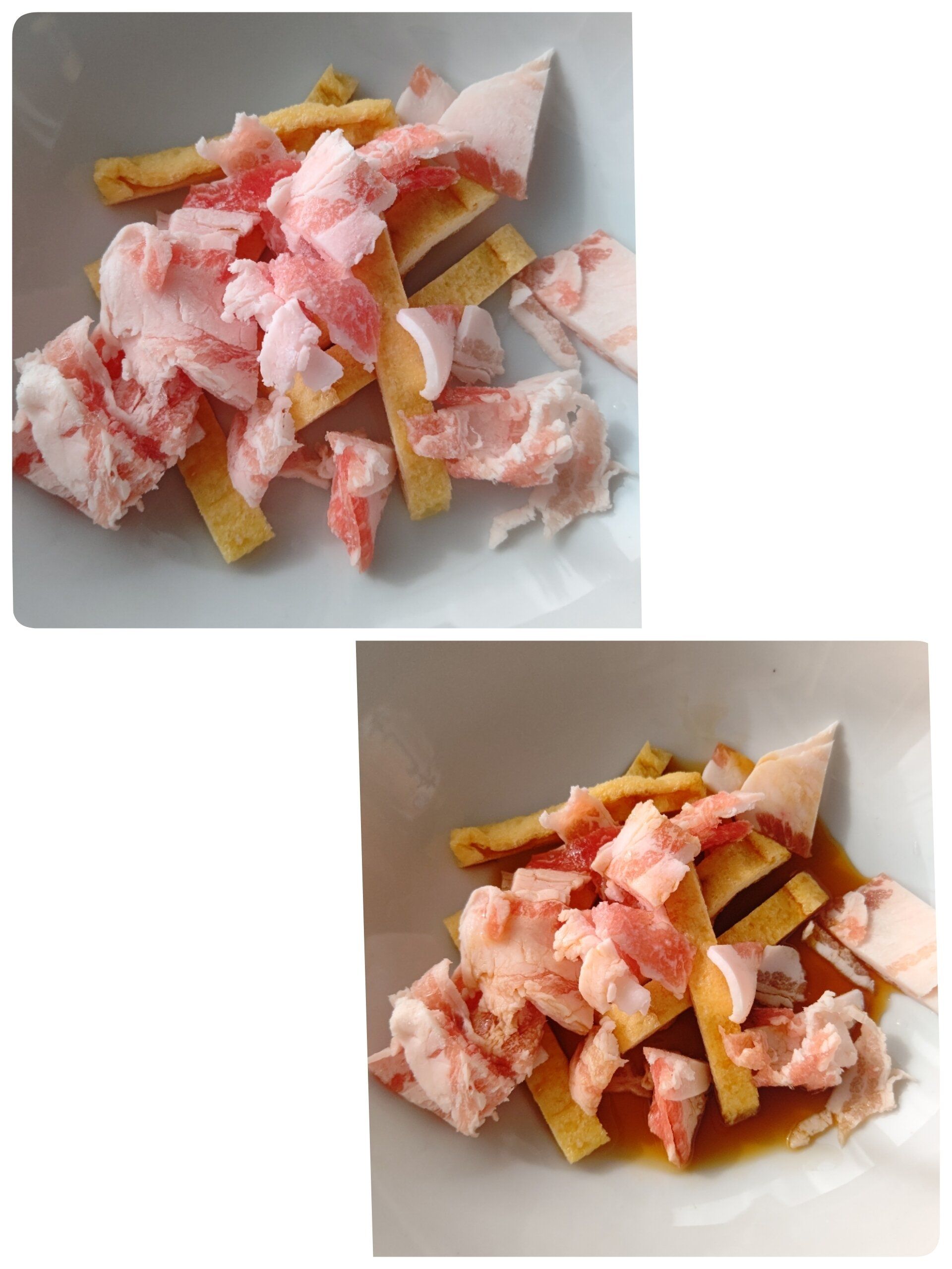 1.耐熱容器に切った豚バラ肉と油揚げ、Aの調味料を入れる。