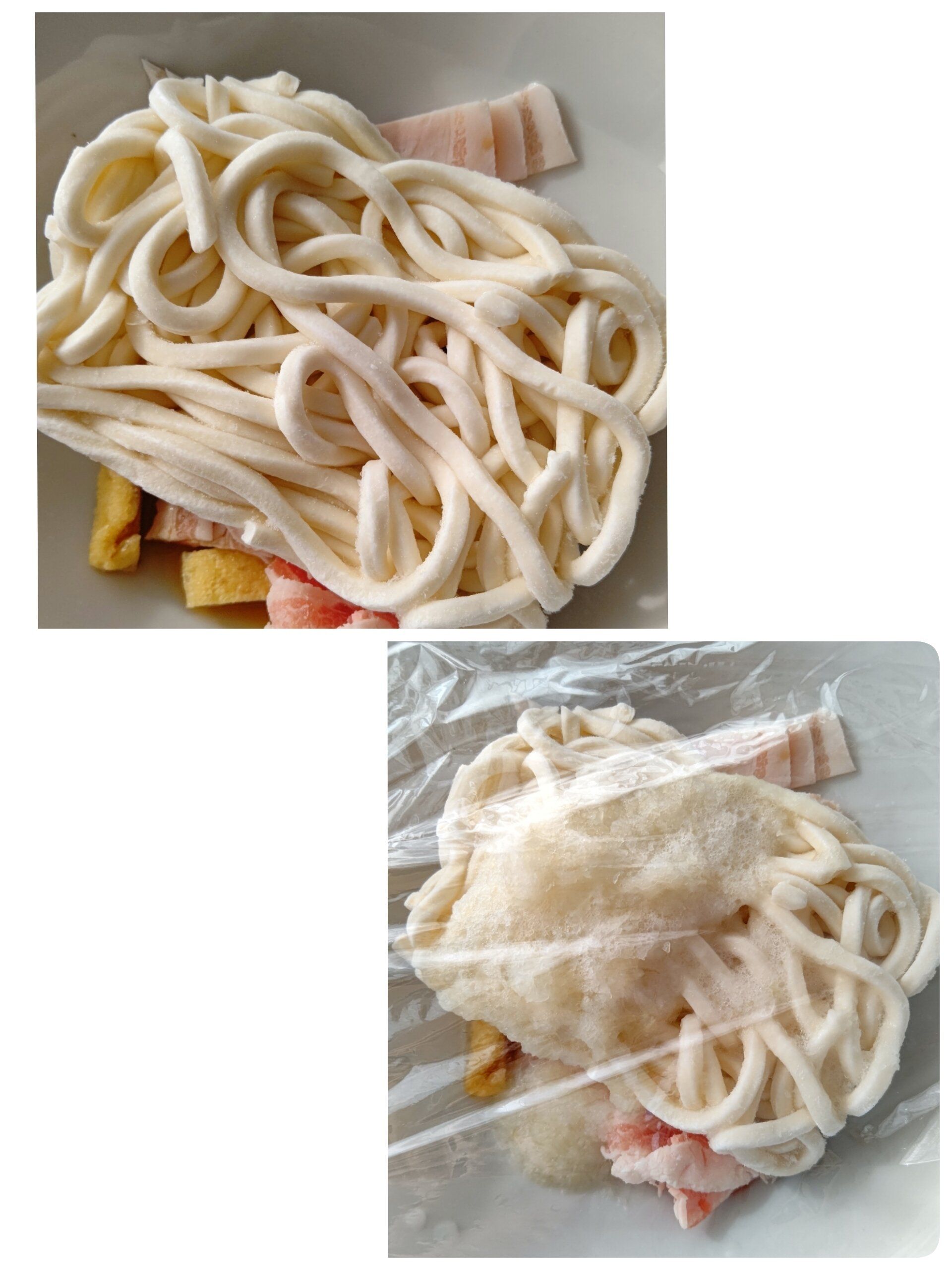 ・器やレンジ出力で加熱時間が変わってきます。うどんが固まっている場合は加熱時間を増やして調整して下さい。