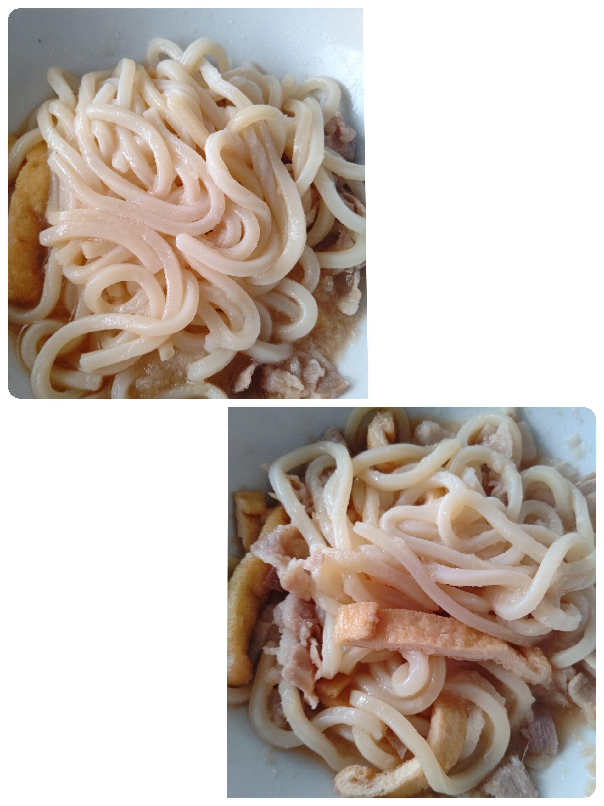 耐熱容器に油揚げと豚肉、調味料と冷凍うどん、大根おろしを入れてレンジでチンして混ぜるだけ!