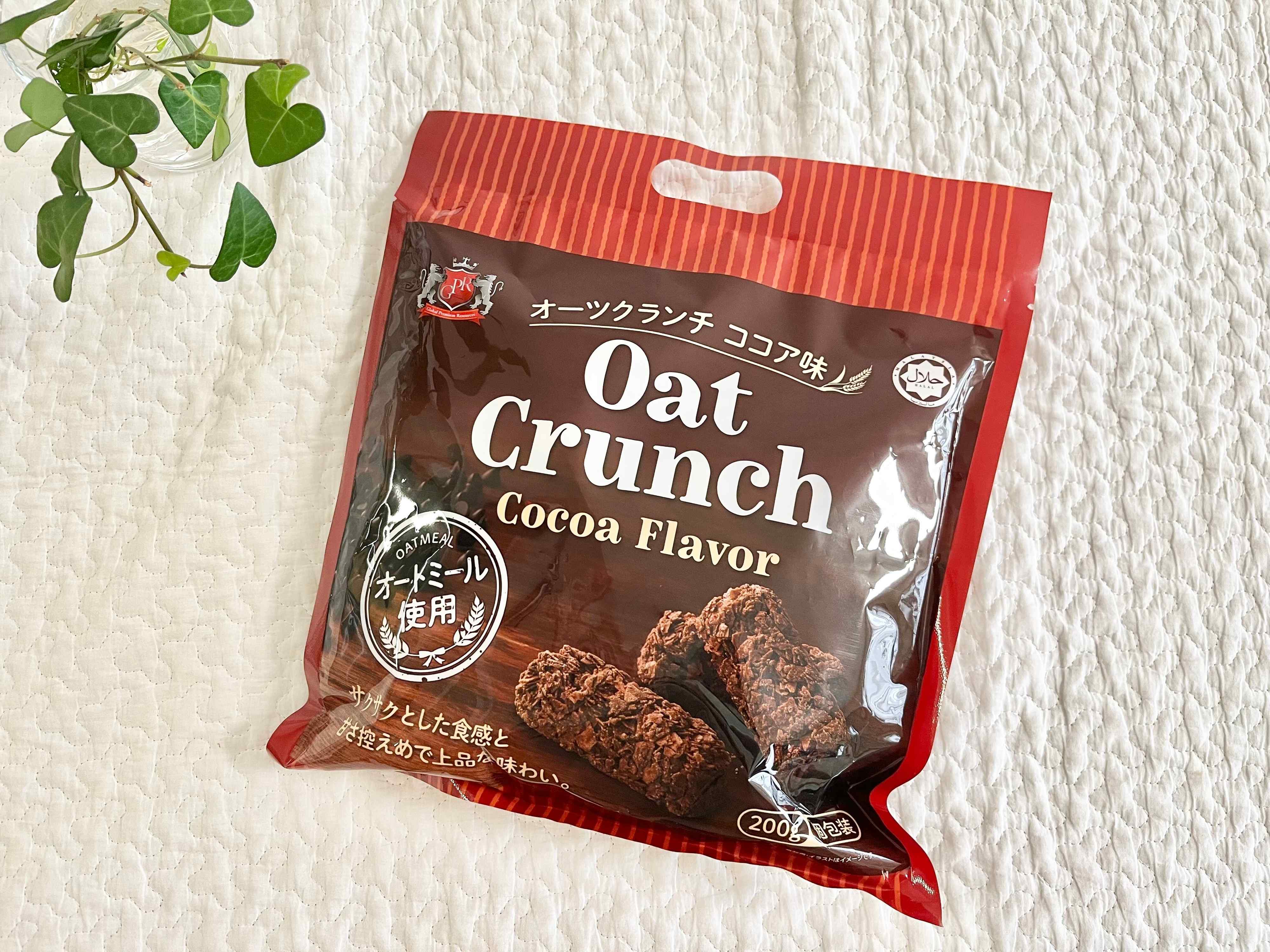 ご紹介するのは、業務スーパーの「オーツクランチ(ココア味)」という、ココア味のクランチバーです。なんとこちらの商品は、食物繊維やミネラルなどの栄養が豊富で、スーパーフードとして名高いオートミールを使用しているんですよ!原産国はマレーシアで、1袋200g入り、267円で販売されています。
