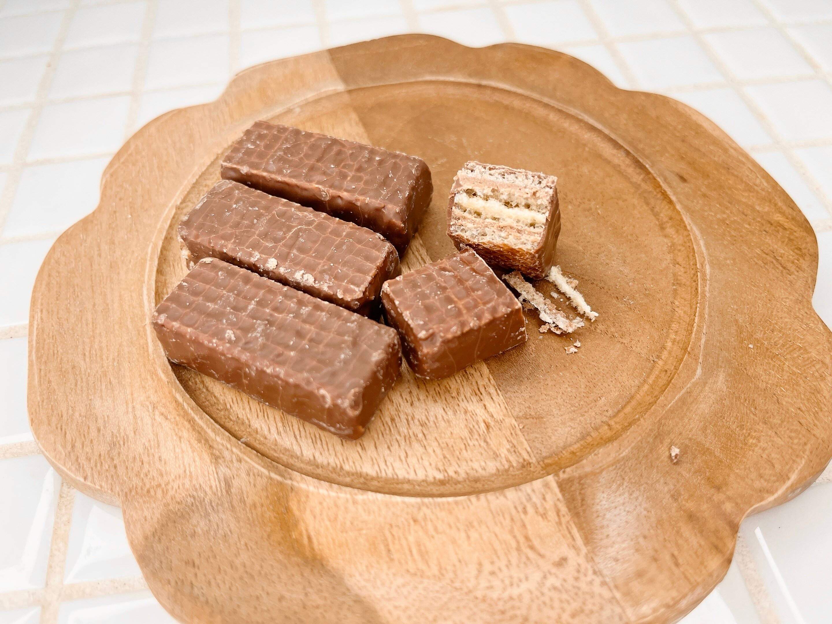 一口サイズのサクサクのウエハースにチョコレートでコーティングされている商品です。
