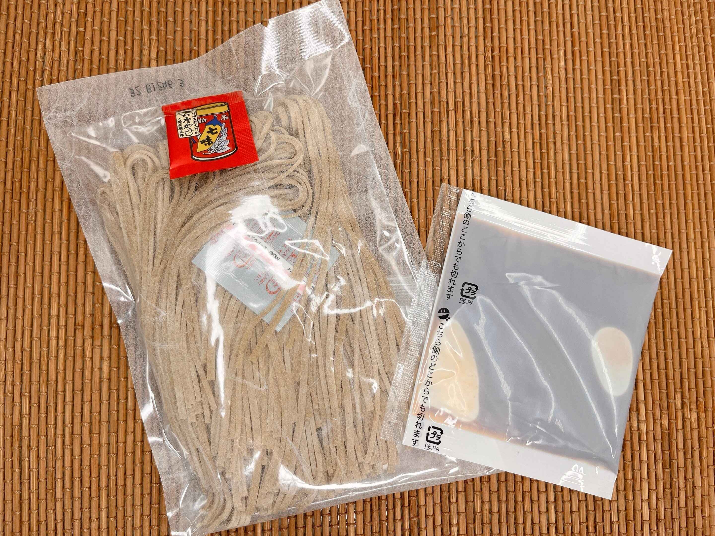 袋の中には半生麺の蕎麦、七味唐辛子、つゆが入っています。
