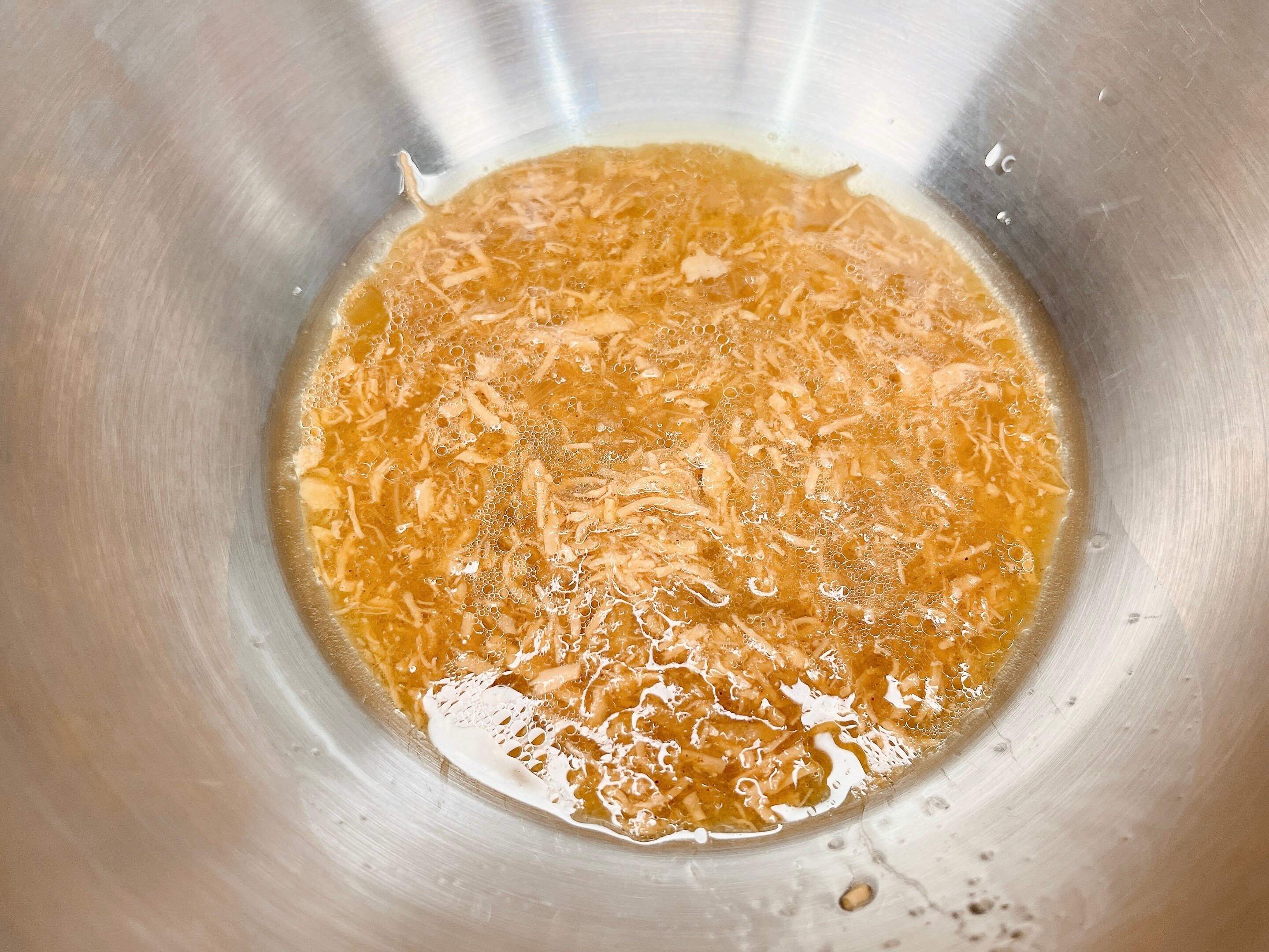 本品をボウルに出してみました。蒸し鶏を具材に生姜、鶏あぶらを加え、台湾ならではの香辛料がふわっと香る合わせ調味料です。