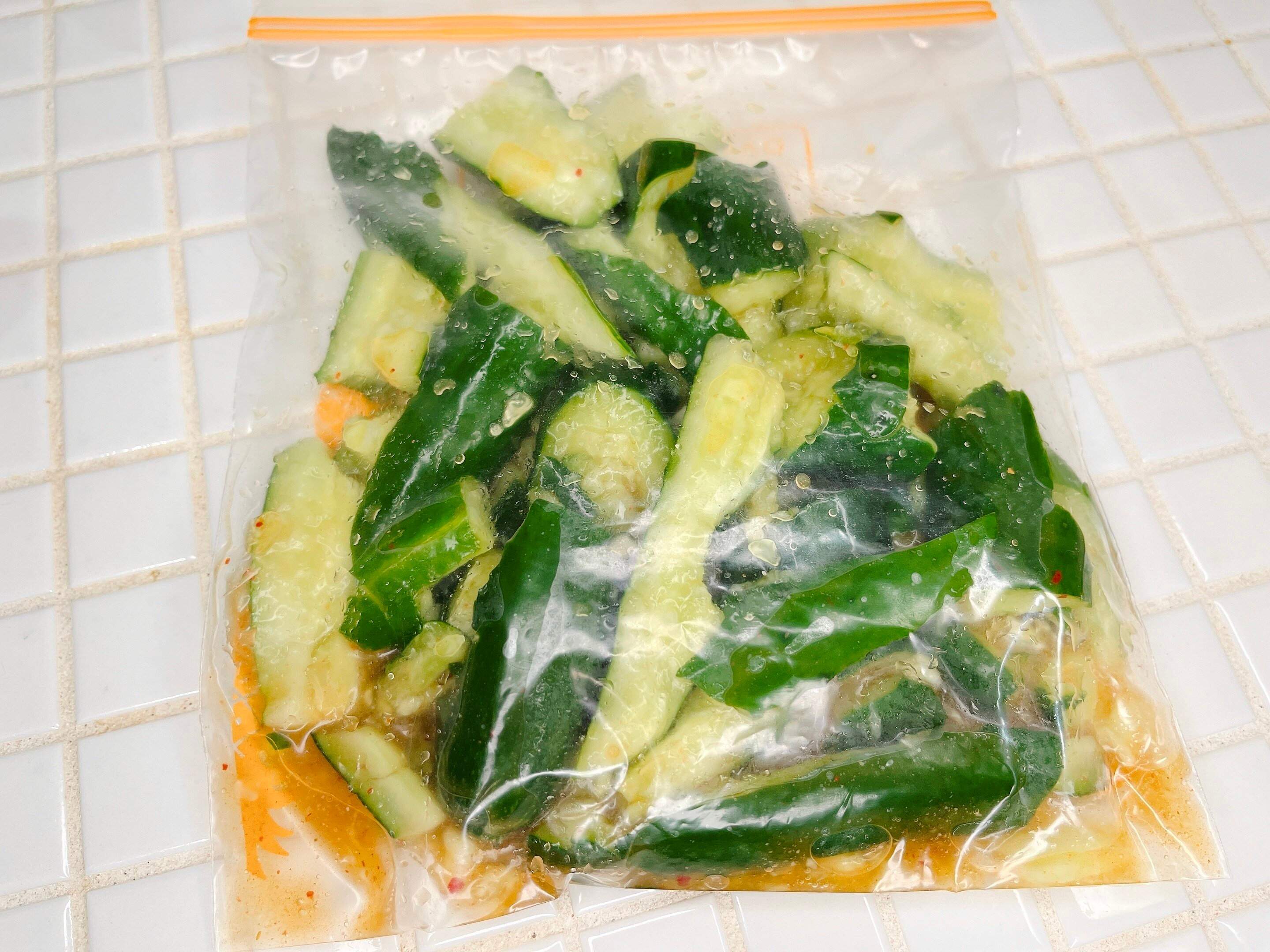 2 たたいたきゅうりが入った保存袋に本品を一袋入れます。